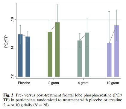 Hierzu gibt es eine spannende Studie, die den Effekt drei verschiedener Dosierungsstrategien direkt miteinander verglichen hat: 2 g vs. 4 g vs. 10 g – wobei eine höhere Dosierung von 10 g pro Tag die PCr-Speicher im Gehirn deutlich effektiver angehoben hat als 2 g oder 4 g (7).