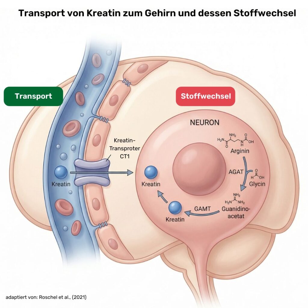 Sie funktioniert wie ein selektiver Türsteher. Der Kreatin-Transporter (CT1), der den Übertritt ermöglicht, kommt dort nicht in hoher Zahl vor (2). Entsprechend gelangt nur begrenzt Kreatin aus dem Blut ins Gehirn. Diese Einschränkung kann teilweise durch die eigene Kreatinproduktion im Gehirn kompensiert werden. Die dafür notwendigen Enzyme, AGAT und GAMT, sind direkt in Nervenzellen vorhanden (3).